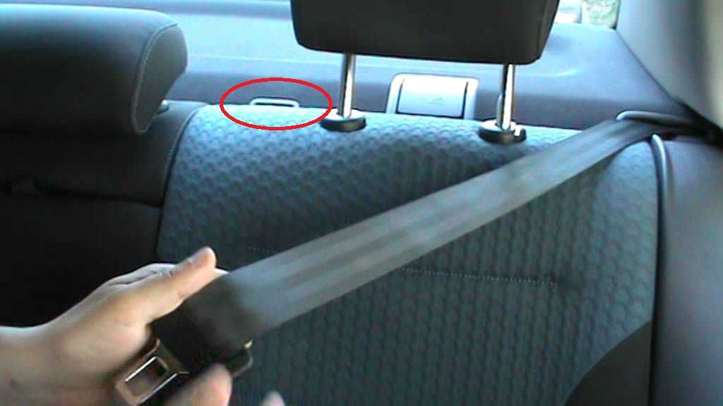 С помощью удобного предмета, например, металлического фиксатора на ремне безопасности, нужно проникнуть в данное отверстие, вставлять фиксатор ремня необходимо как можно правее, там надо отыскать рычажок и потянуть его вправо, после чего часть спинки заднего сиденья может быть сложена.