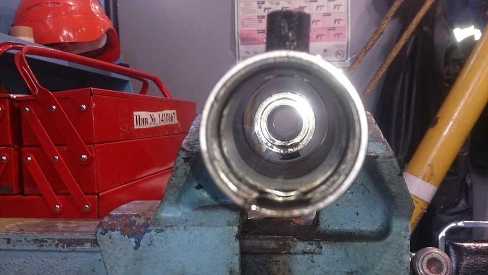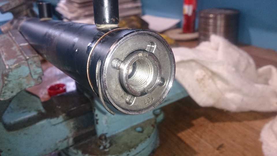 Дальше устанавливаем сухарь вала, пружину сухаря, заглушку и контр. гайку (фото забыл). Находим нейтральное положение натяжки пружины сухаря и затягиваем контр. гайку. Да, кстати, для натяжки пружины отлично подойдет болт с шестигранником на 19. Дальше смазка. В качестве пластичной смазки я использовал газпромовскую смазку с содержанием сульфитом молибдена. Когда осматривал вал, не мог понять почему он внутри полый? А в конце шлицов маленькое отверстие? Пришел к такому выводу что это все необходимо для смазки после сборки, так как нет других способов. И я сделал вот такую приспособу.