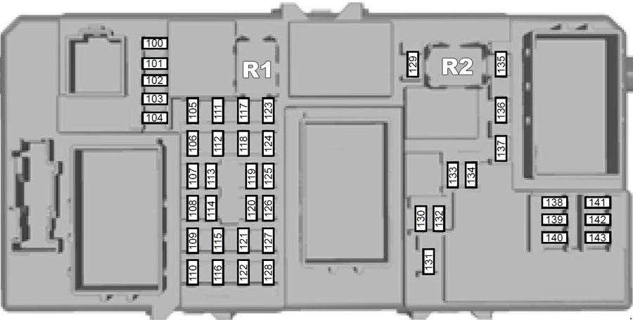 А так же нужна расшифровка:№ 100 — 10А — Электронные модули (питание от замка зажигания)№ 101 — 20А — Люк, сиденье водителя с электроприводом, блок управления приводом крыши (Focus Coupe-Cabriolet)№ 102 — 10А — Блок управления отопителем, регулировки рулевой колонки, фильтр твердых продуктов сгорания дизельного топлива, приемник системы дистанционного управления№ 103 — 10А — Внешние освещение (питание от аккумуляторной батареи)№ 104 — 10А — Освещение салона, система экономии электроэнергии№ 105 — 25А — Обогрев заднего стекла№ 106 — 20А — Система бесключевого доступа / запуска№ 107 — 10А — Комбинация приборов (питание от аккумуляторной батареи), диагностический разъем№ 108 — 7,5А — Дополнительные функции комбинации приборов (аудиосистема и система навигации)№ 109 — 20А — Прикуриватель, задняя дополнительная розетка№ 110 — 10А — Дневные ходовые огни№ 111 — 15А — Топливный насос (бензиновые двигатели)№ 112 — 15А — Аудиосистема (питание от аккумуляторной батареи)№ 113 — 10А — Дневные ходовые огни№ 114 — 10А — Комбинация приборов (питание от замка зажигания), иммобилайзер№ 115 — 7,5А — Внешние освещение (питание от замка зажигания)№ 116 — 20А — Противотуманный свет№ 117 — 7,5А — Освещение номерного знака№ 118 — 20А — Модуль электрооборудования левой задней двери№ 119 — 15А — Розетка в багажном отделении№ 119 — 25А — Розетка в багажном отделении, разъем прицепа№ 120 — 20А — Модуль электрооборудования правой задней двери№ 121 — 20А — Подогрев передних сидений№ 122 — 10А — Подушки безопасности№ 123 — 7,5А — Обогрев зеркал№ 124 — 7,5А — Габаритный свет с левой стороны№ 125 — 7,5А — Габаритный свет с правой стороны№ 126 — 20А — Система бесключевого доступа / запуска№ 127 — 25А — Стеклоподъемники№ 128 — Не используется№ 129 — 20А — Стеклоочиститель№ 130 — Не используется№ 131 — 15А — Стеклоочиститель заднего стекла№ 132 — 15А — Лампы стоп-сигнала№ 133 — 25А — Модуль электрооборудования двери переднего пассажира, реле центрального замка№ 134 — 20А — Модуль электрооборудования двери водителя, центральный замок№ 135 — 20А — Дневные ходовые огни№ 136 — 15А — Стеклоомыватель, обогрев жиклеров стеклоомывателя№ 137 — 10А — Резервное питание противоугонной системы№ 138 — 10А — Блок управления двигателем, электронная педаль газа, блок управления автоматической коробкой передач№ 139 — 10А — Дальний сеет правой фары№ 140 — 10А — Дальний свет левой фары№ 141 — 10А — Лампы заднего хода, зеркала с электроприводом№ 142 — 15А — Ближний свет правой фары№ 143 — 15А — Ближний свет левой фары