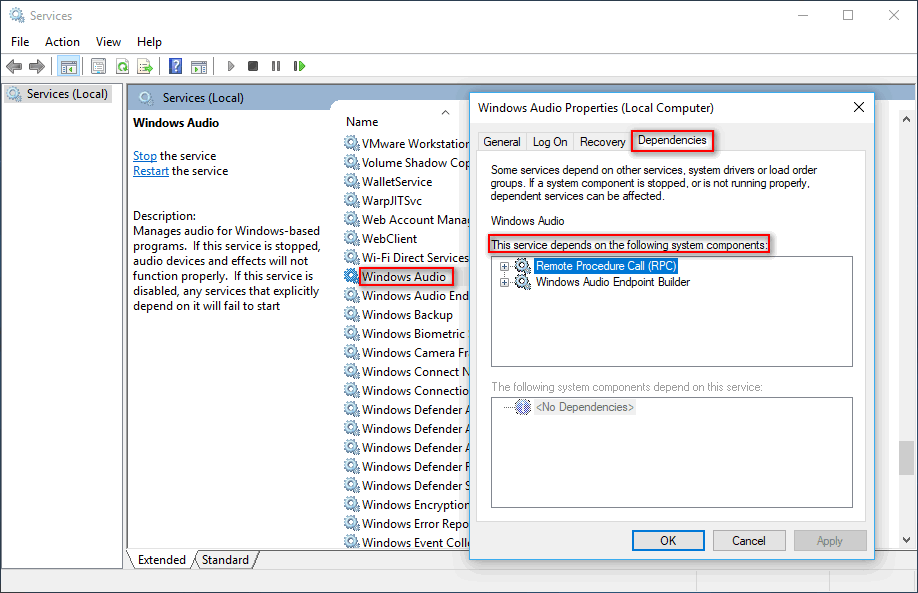 Служба звука в Виндовс 10 имеет три дополнительные службы: «Планировщик классов», «Средство построения точек», «Вызов процедур». Если хотя бы одна из них не будет работать, средство не запустится. Для включения опций пользователю потребуется во вкладке «Зависимости» включить данные настройки.