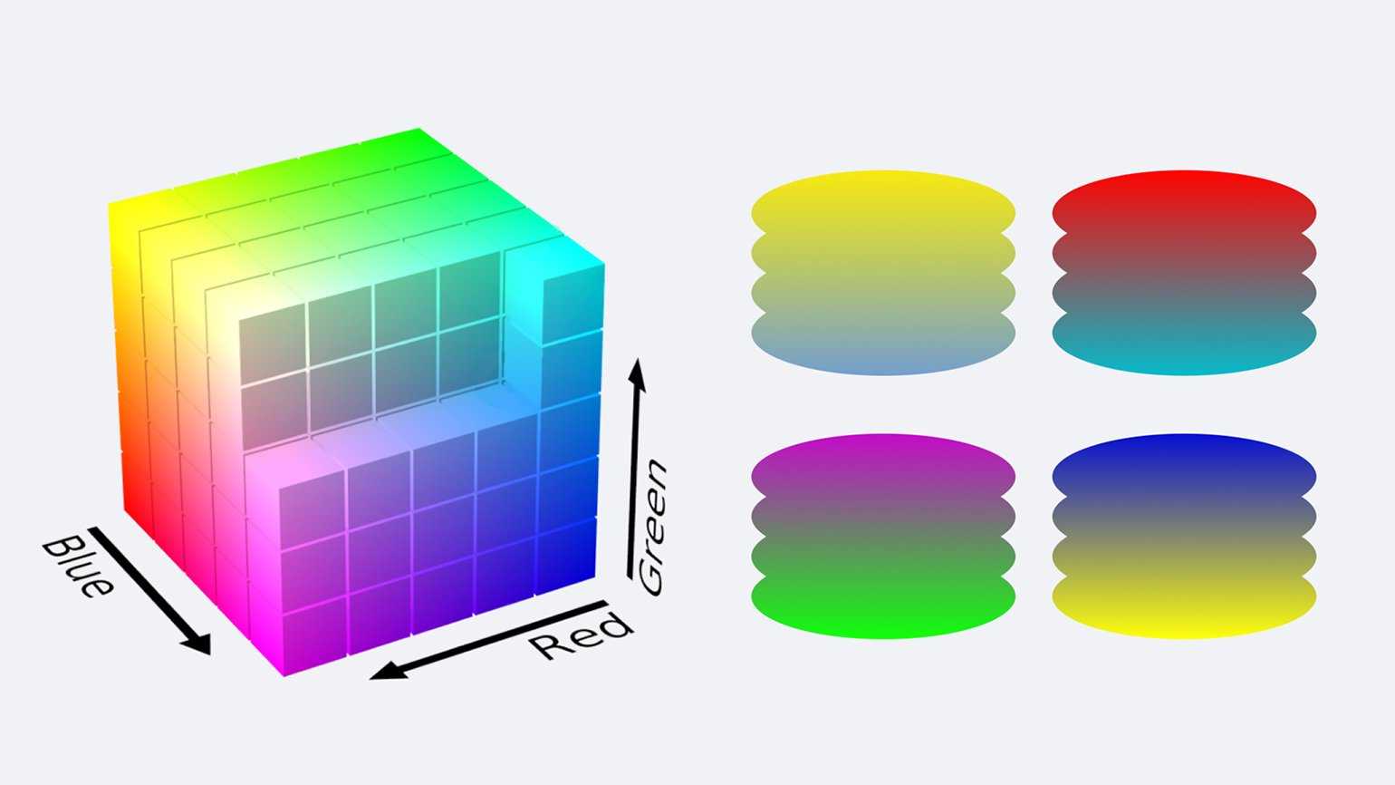 Расположение оттенков в кубическом пространстве RGB и примеры созданных в RGB градиентов. Изображение: Wikimedia Commons, Александр Кароза