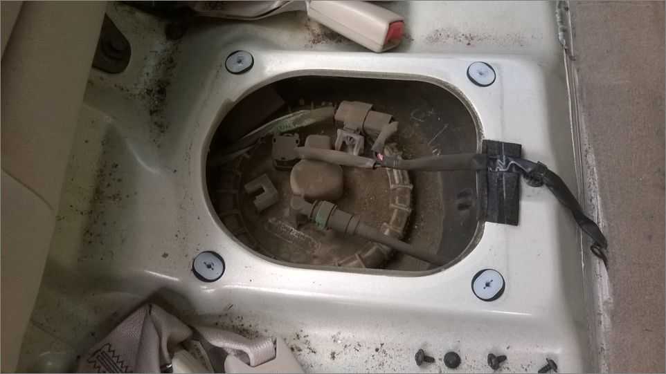 Сначала демонтируется заднее пассажирское сиденье. Открутив четыре болта нужно открыть люк. Далее следует отключить все коммуникации, идущие к бензонасосу. Бензонасос с коммуникациями