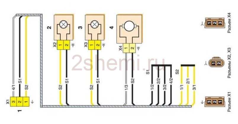 4 – колодка жгута проводов датчиков системы парковки к колодке жгута проводов заднего.