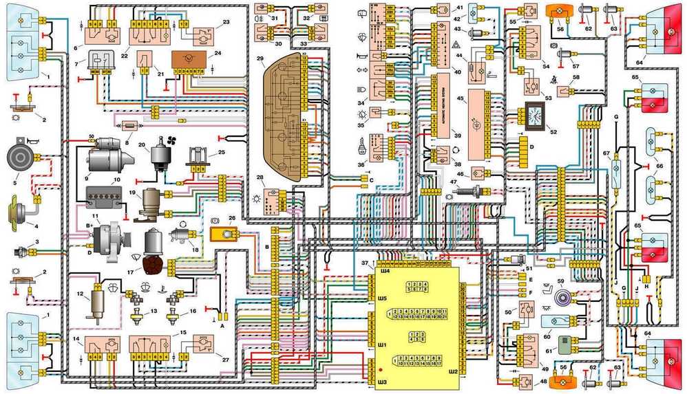 Схема электрических проводов и предохранителей дает понимание всей работы инжекторной системы, а также показывает конкретное положение каждого из элементов. На ней располагаются следующие элементы: