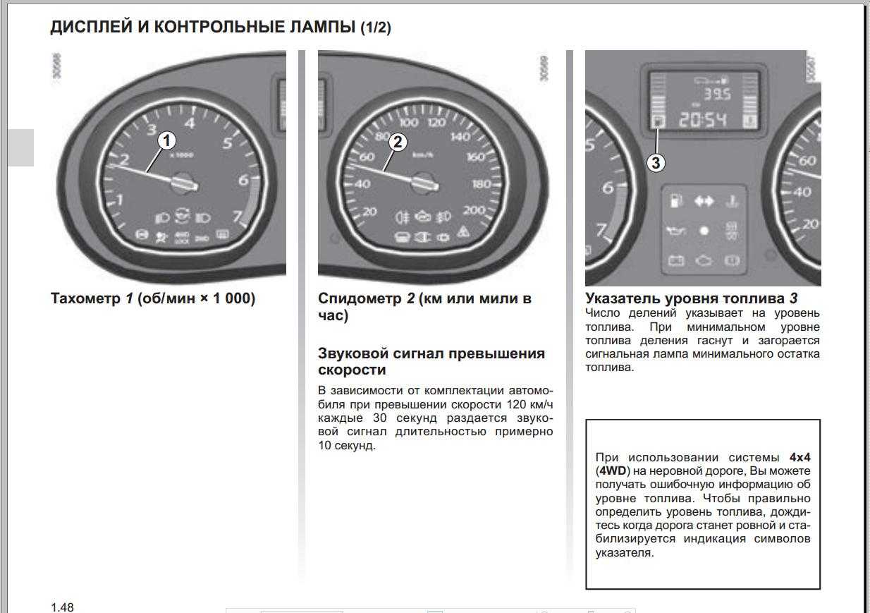 Панель приборов Рено Дастер имеет специальные световые индикаторы, которые сигнализируют, в каком состоянии находятся все элементы системы, а также помогают вовремя заметить неисправность отдельно взятого узла. Ниже представлен щиток стандартной модели Рено, где указаны основные индикаторы.