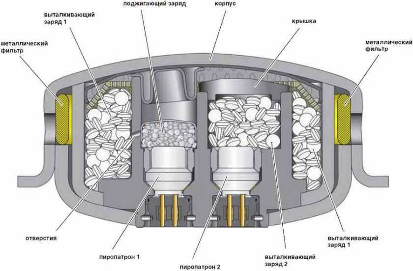 Последний, по сути, представляет собой взрыватель и считается главным исполнительным механизмом ПБ. Когда на него поступает напряжение, спираль тут же нагревается, поджигая сам пиропатрон. В процессе горения выделяются газы, которые и наполняют ПБ. Пиропатрон преднатяжителей ремней – механический. Если используется резистор номиналом 2,2 Ом, он создает иллюзию того, что нить накала в рабочем состоянии.
