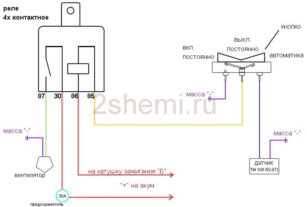 На контактах реле 87, 30, на проводе от аккумулятора к предохранителю и массе вентилятора будет большой ток и по этому там обязательно используем провода, сечением не менее 2 мм иначе более тонкий провод не выдержит и сгорит.